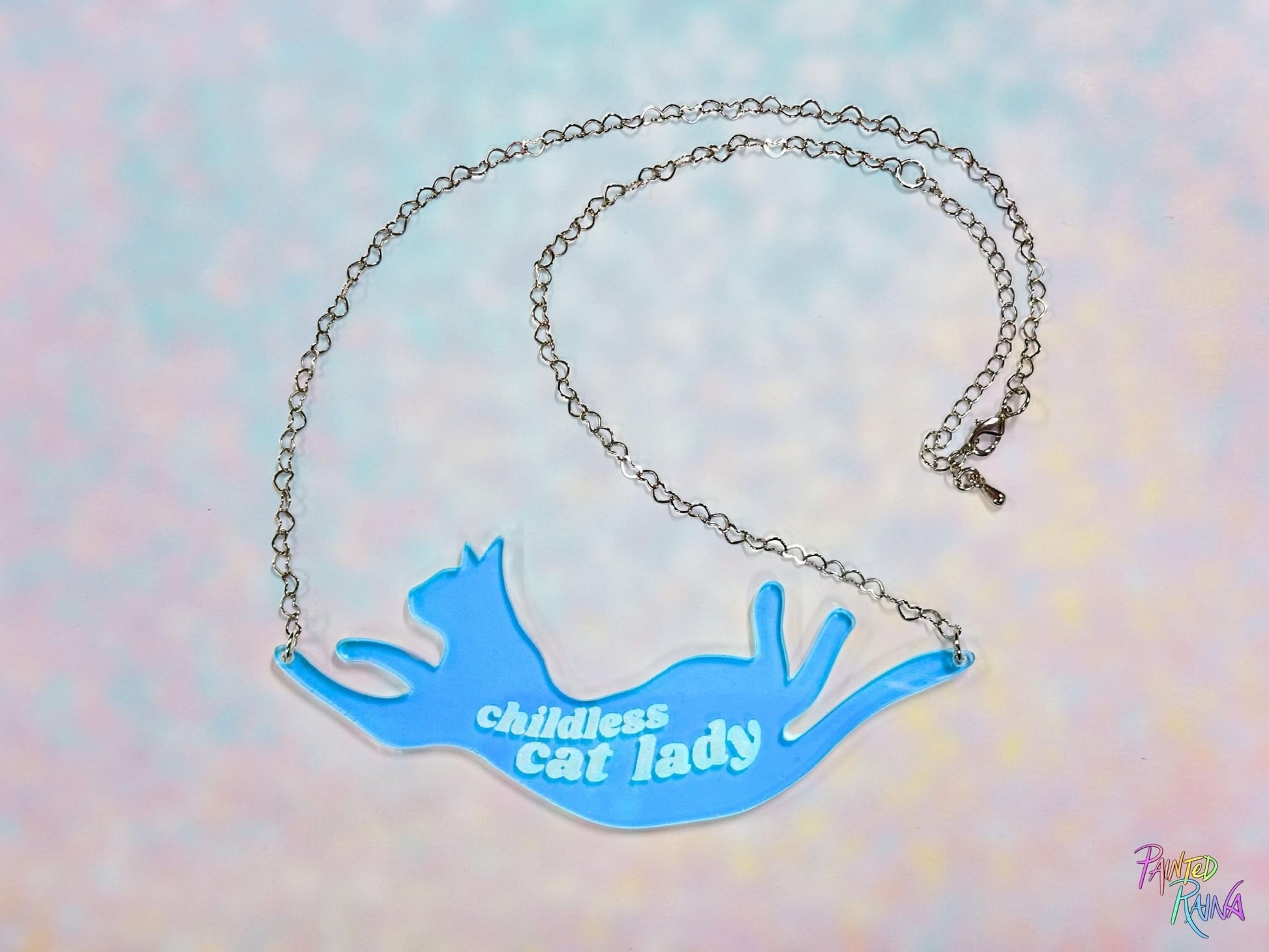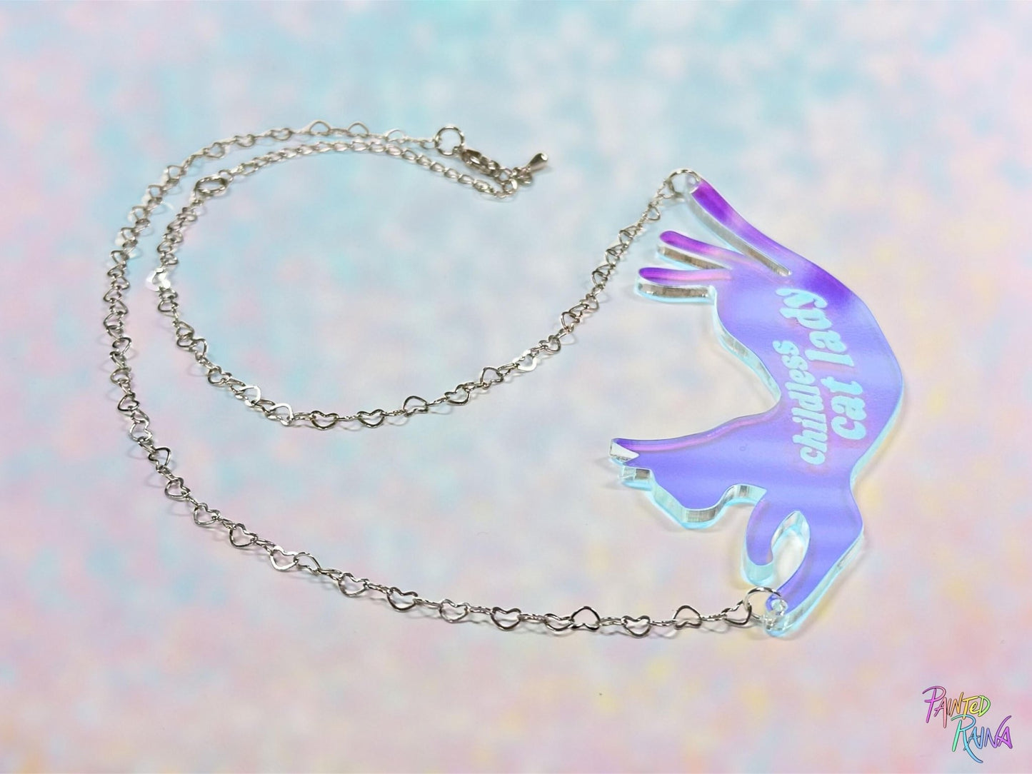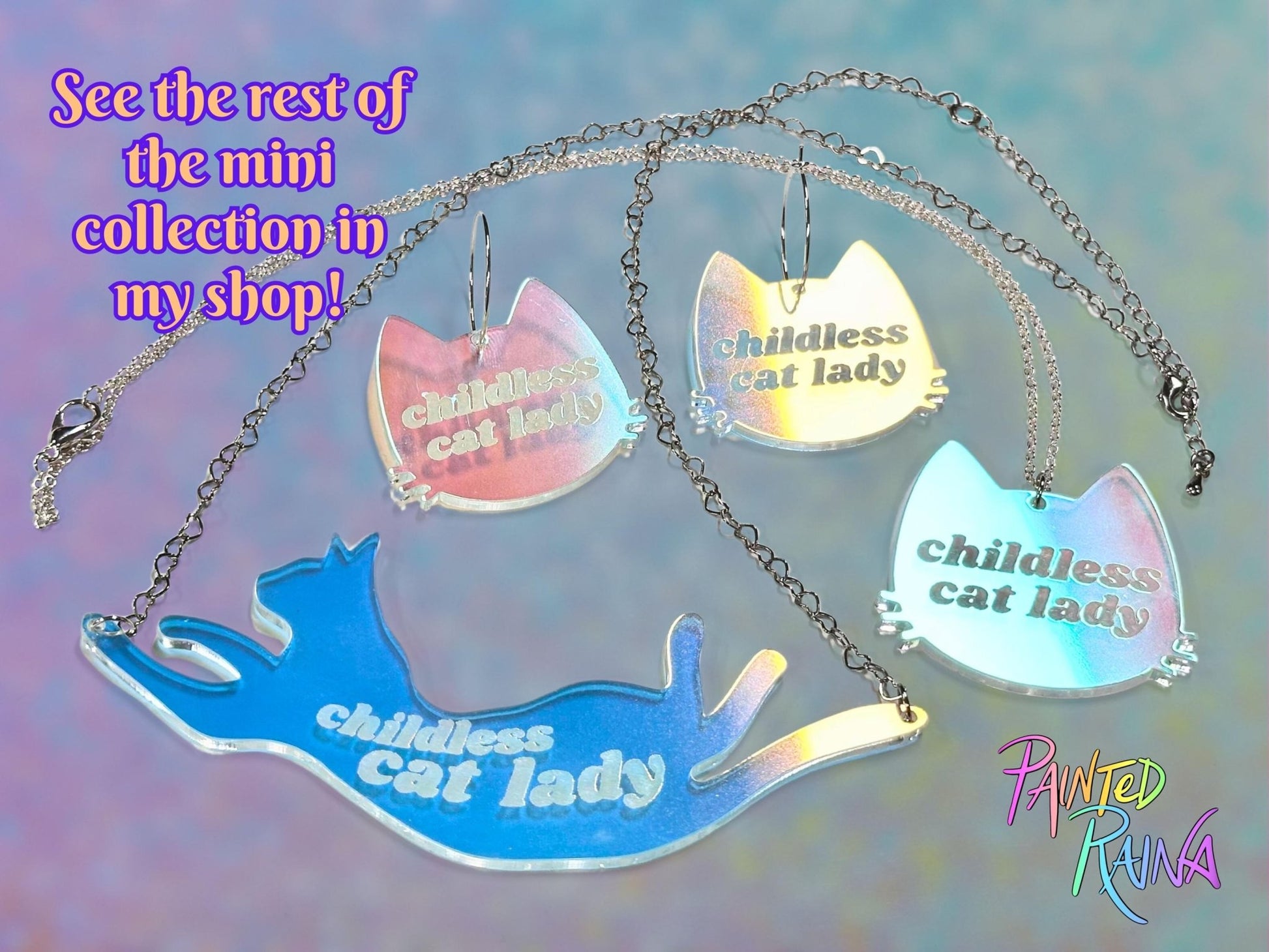 I'm a childless cat lady and I'm loud and proud! Stand up for your rights and make a statement with this engraved iridescent feline silhouette necklace!
