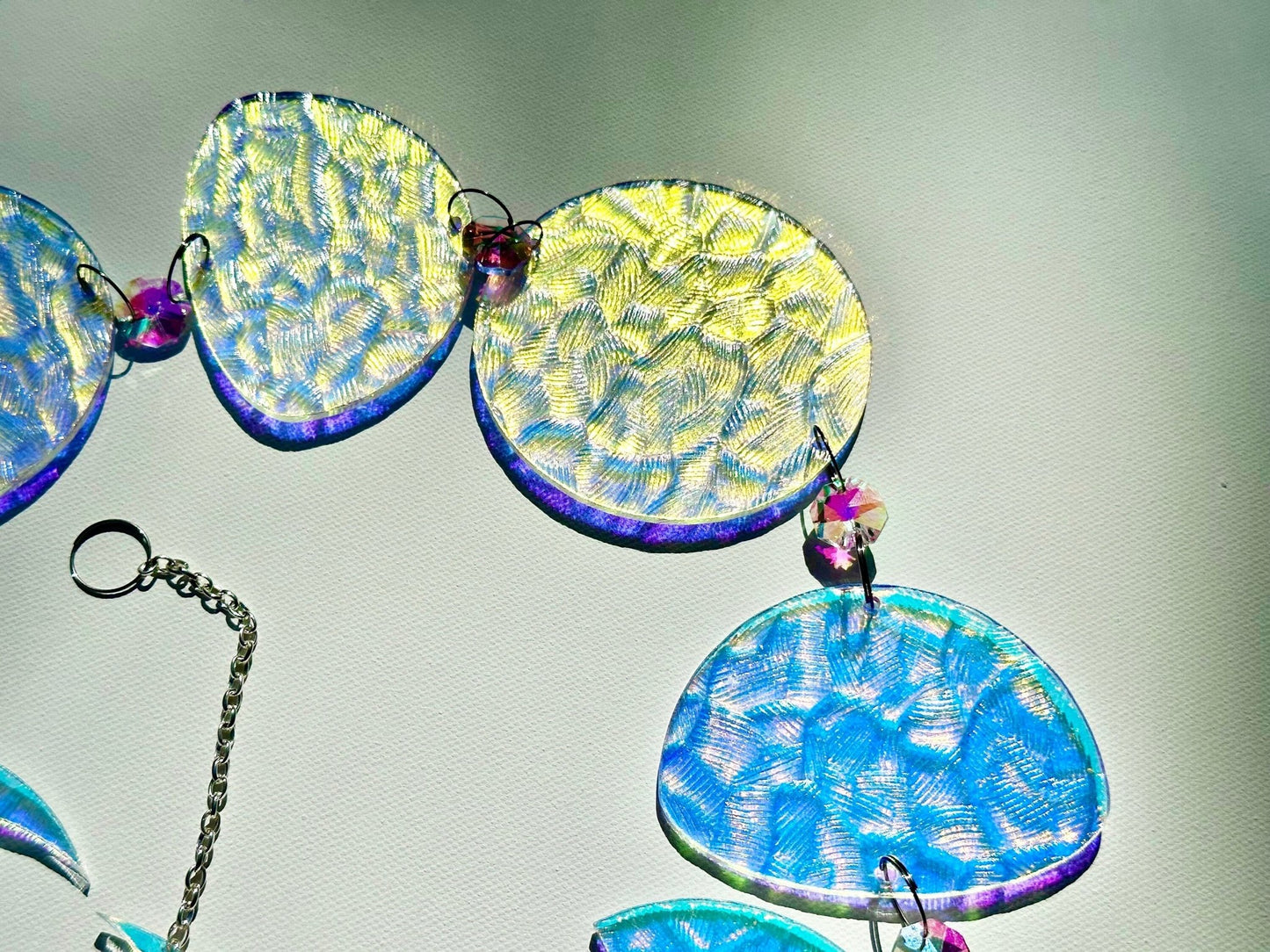 Introducing our beautiful Seashell-textured iridescent Crystal Moon Phases Suncatcher, a truly ethereal and enchanting addition to your space! This glimmering statement piece is the perfect blend of celestial magic and mesmerizing aesthetics, making it an ideal gift for both your home and office. Its sparkling crystals and pleasing symmetrical moon phase design create a captivating display that dances with the light, casting a spell of beauty and grace in any room. Hang this stunning mobile on your wall, and watch as it transforms your space into a whimsical haven filled with mystical vibes. Elevate your surroundings with our enchanting and sparkling suncatcher - because who can resist a touch of witchy home decor?