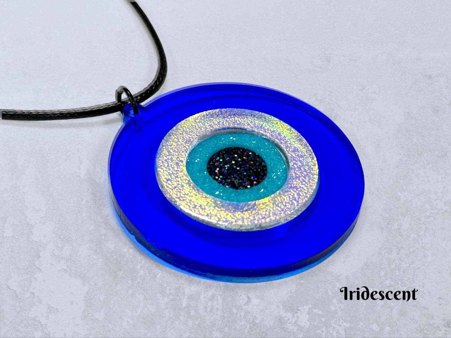 Evil Eye amulets are used as talismans for protection. These amulets are handmade from various acrylics with a sparkling resin druzy ring for the iris. The eye is a 2" circle.