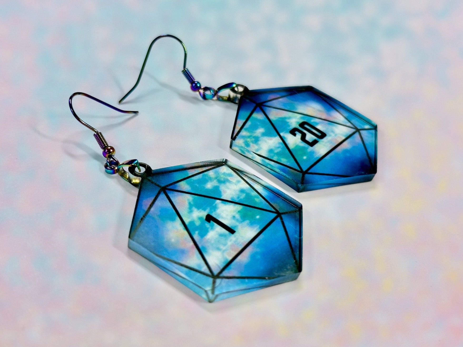 Galactic D20 Dice Earrings | Outer Space Nebula Design