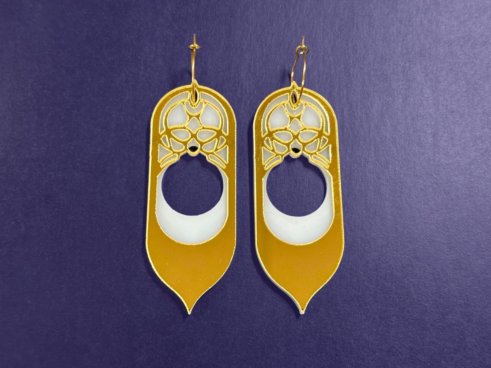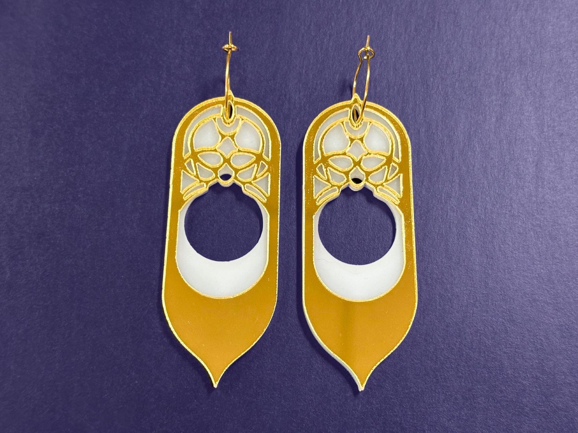 Experience luxurious white and gold glamour with the exclusive "Galadriel" earrings, available only in my shop. These elegant earrings measure approximately 2.5 inches (70mm) tall and 1 inch (25mm) wide, and are made from lightweight, laser-cut acrylic for comfort. Each pair is crafted in a smoke-free home and designed to ensure you’ll receive compliments wherever you go.