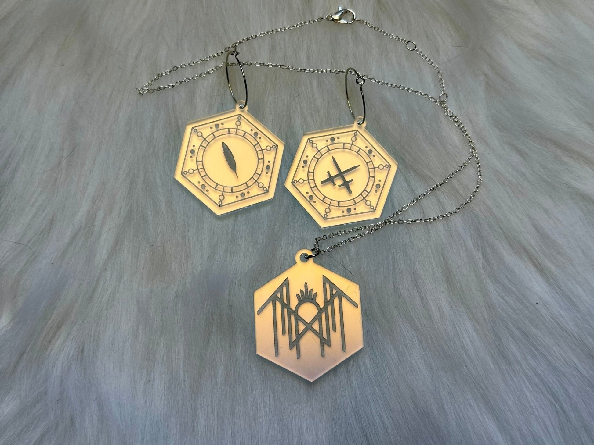 This ethereal dangle earrings and pendant set features engraved iridescent frosted acrylic that shifts in color depending on the lighting. The earrings are 45mm tall and about 40mm wide, and the pendant is 50mm tall and about 45mm wide. They are all 3mm thick.