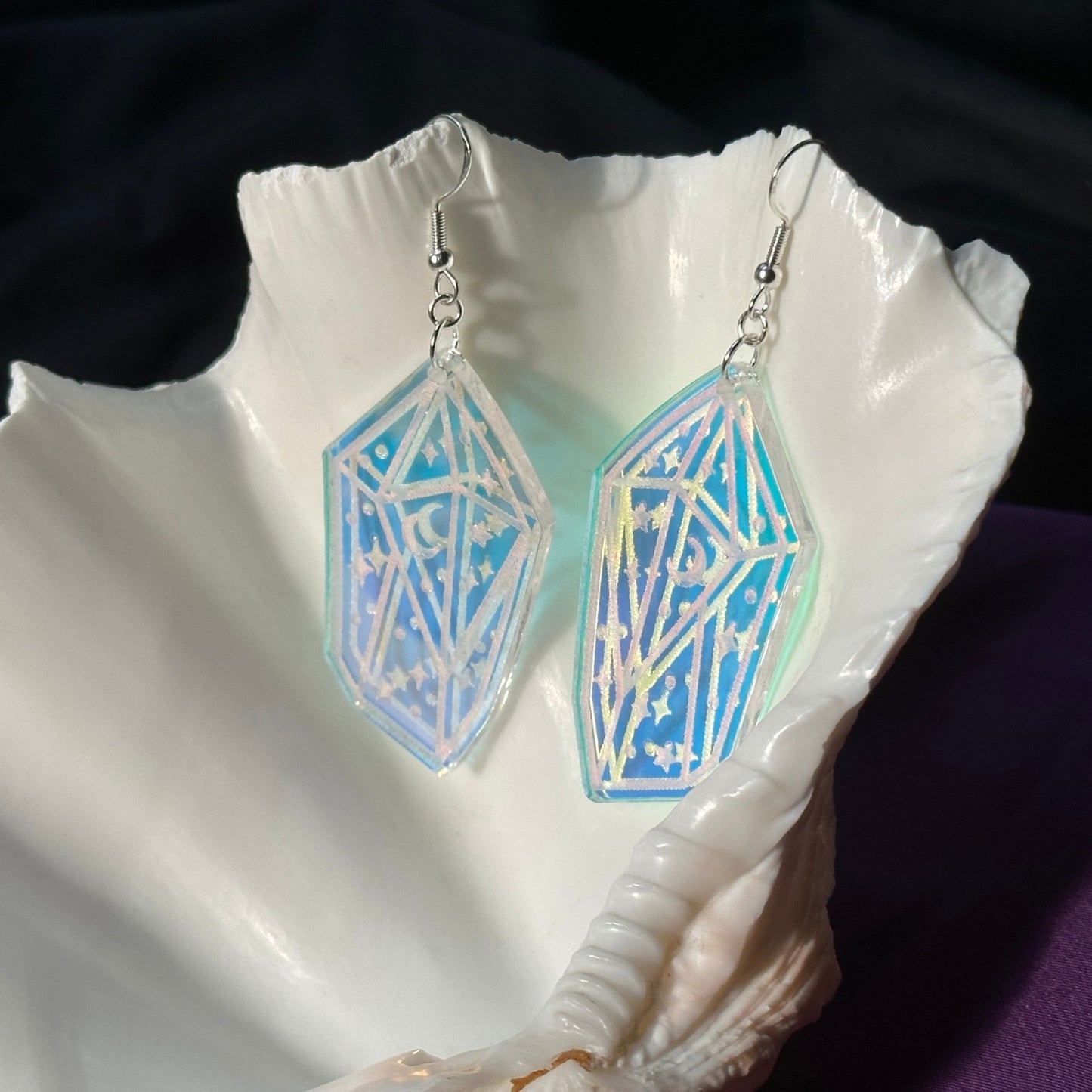 Introducing our enchanting Iridescent Mystical Crystal Earrings, the perfect accessory for those who embrace their witchy side and adore the whimsical aura of the fairy, cottagecore aesthetic. Crafted with a captivating color-shift effect, these acrylic statement earrings showcase the ethereal beauty of iridescence, drawing attention with every movement. Whether you're a rock hound, geologist, or simply seeking a unique accessory, these earrings are sure to captivate your senses. Gift these fun and mesmerizing earrings to a loved one on their birthday, and let them experience the magical allure of these enchanting 'mystical crystals.'