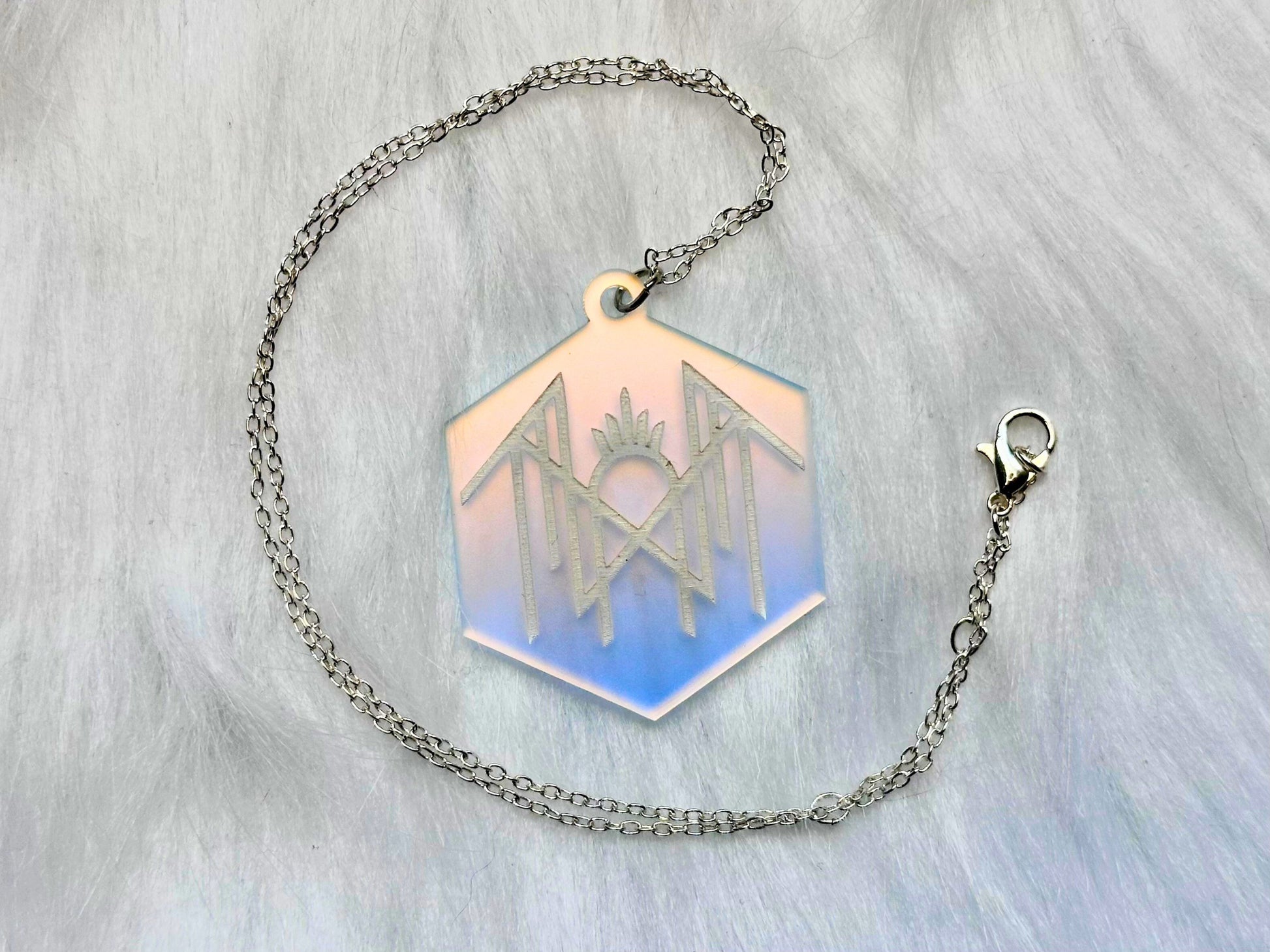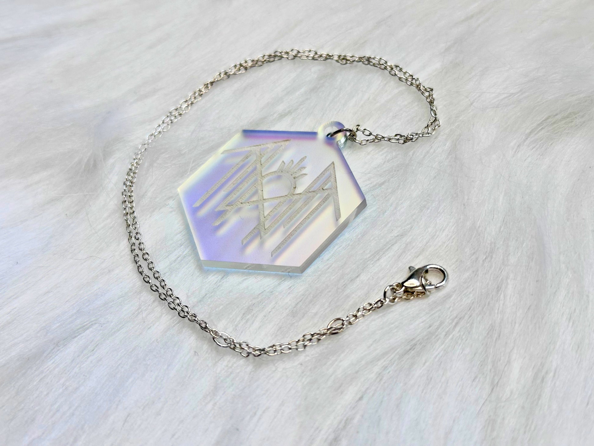 This ethereal pendant is made from engraved iridescent frosted acrylic that shifts in color depending on the lighting. It comes with an 18" sterling silver chain, or a gold plated chain for a small upcharge. The charm is 50mm tall and about 46mm wide, and 3mm thick.