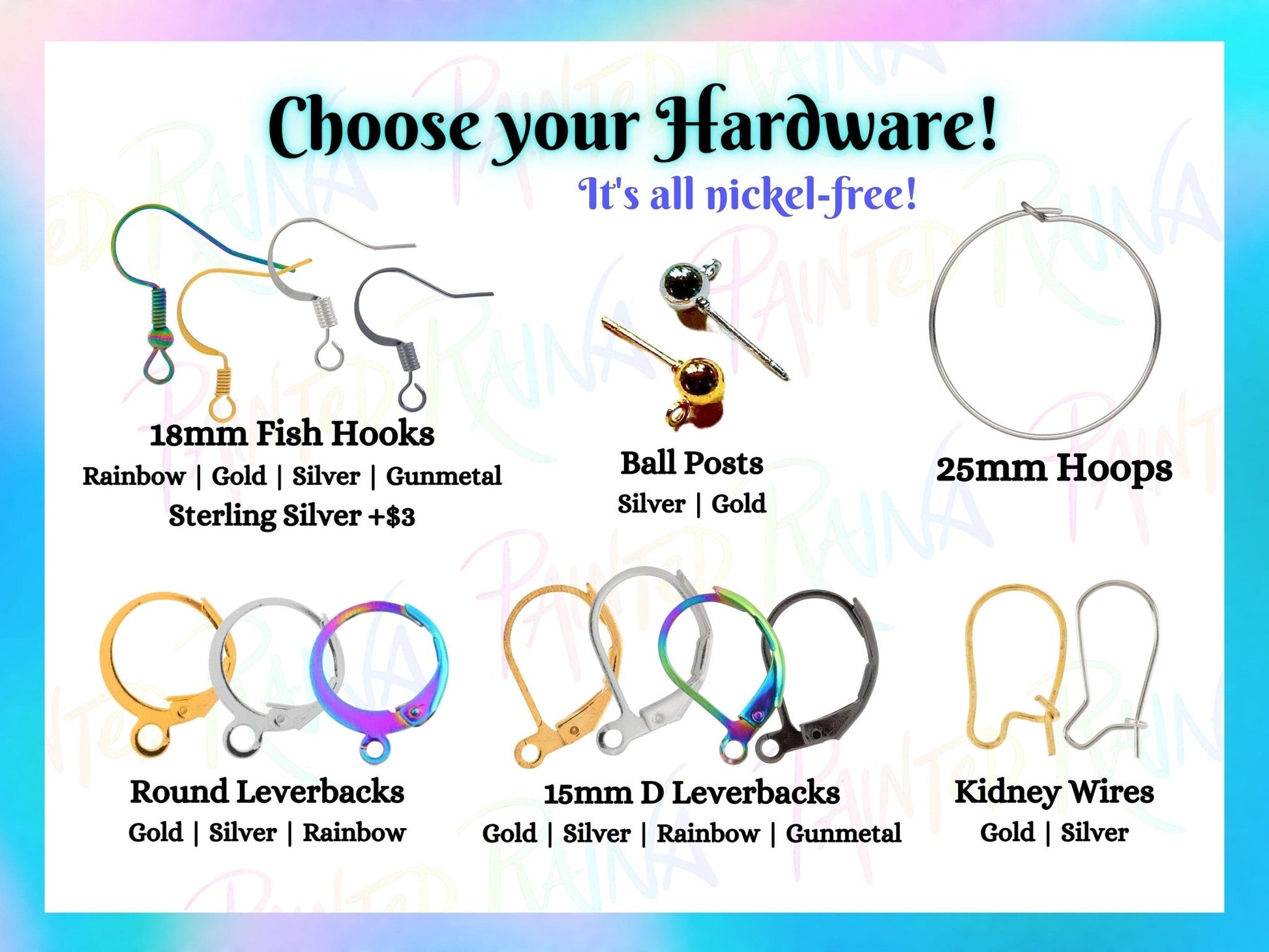 OPTIONS GALORE! I offer several colors and a variety of hardware to accommodate your style, including a Sterling Silver upgrade! See the photos for a visual list of available options. The earrings as pictured are made with blue iridescent acrylic and feature the 25mm hoops.