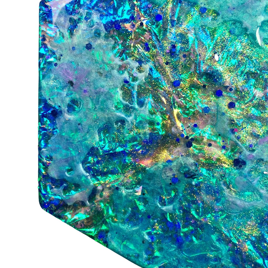 This Opal Stone features shades of turquoise, aqua, teal and a glittering streak of gold and gems amid an electric blue sea of shimmering and holographic elements.