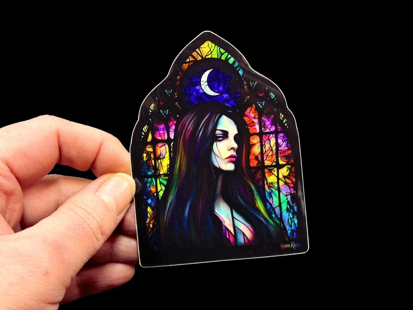 This high-quality, glossy vinyl sticker depicting a gothic woman glaring from a vividly-colored stained glass window measures 3.5 inches tall and 2.5 inches wide. These premium stickers are durable, UV protected, waterproof, and weather proof, with an expected outdoor life of 2-4 years!